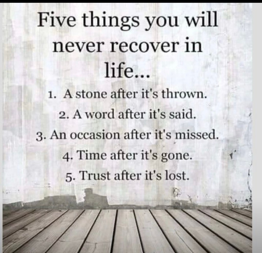 A stone after it’s thrown, a word after it’s said, an occasion after it’s missed, time after it’s gone, and trust after it’s lost.